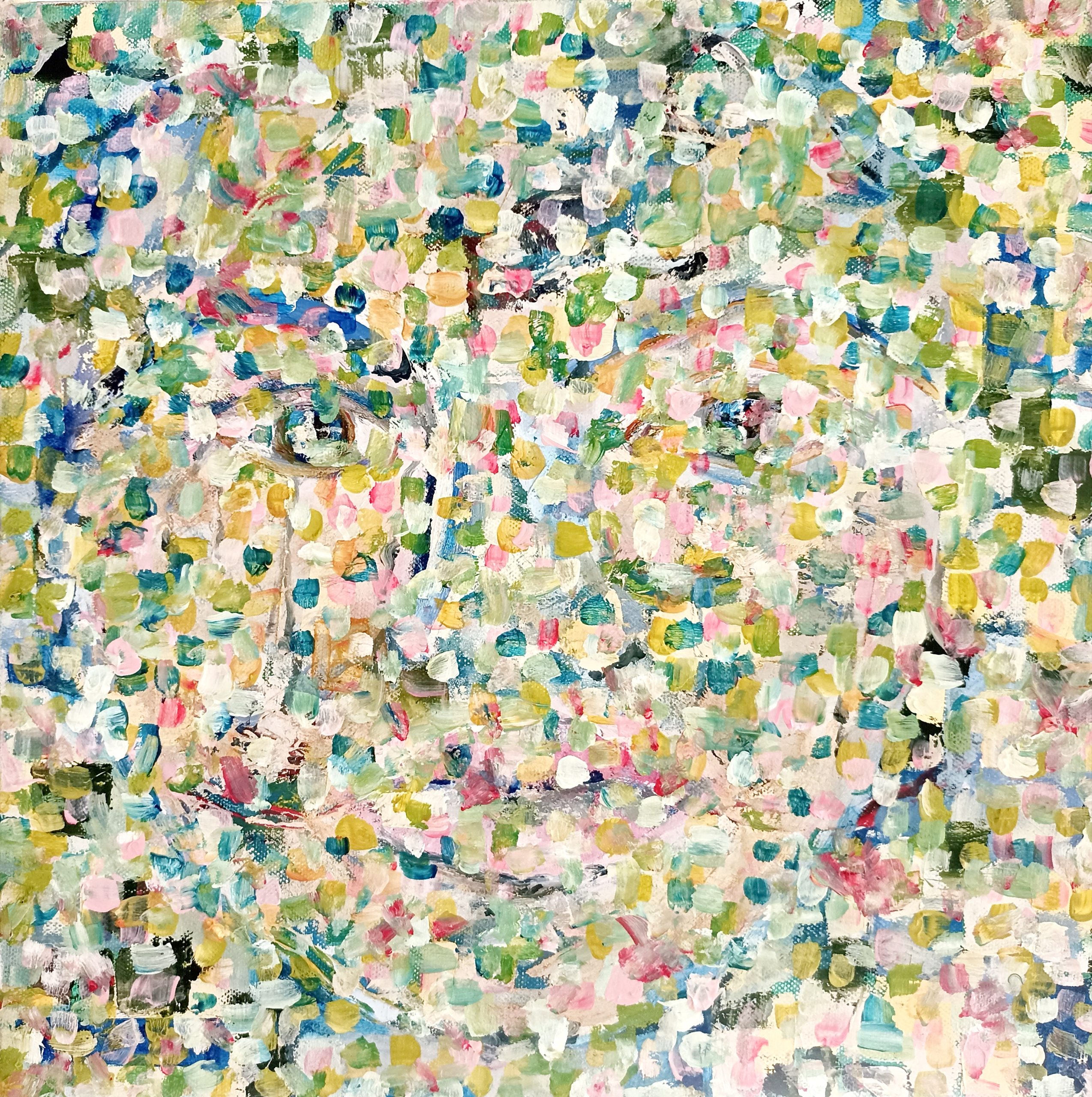 Delicate flecks and marks screen a woman’s face to create a multi faceted artwork that has a lot of impact. The painting is only 40 x 40 cm unframed and can be removed from the wooden frame for shipping.